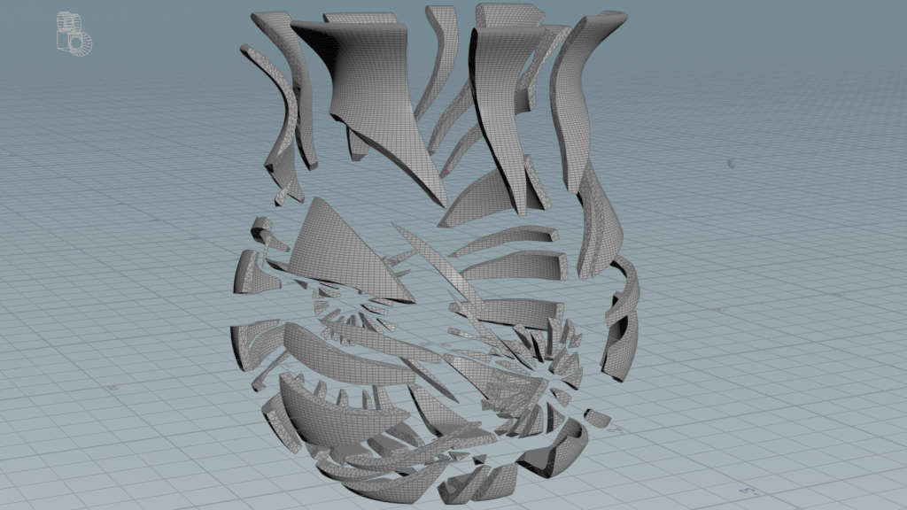 Finally, after the simulation, additional realism often comes from post-processing: adding velocity blur to fast-moving shards, generating fine secondary debris from larger chunks, and using volumes to simulate air displacement or dust from the impact. These subtle layers help sell the speed and violence of the bullet passing through the vase, making the effect feel more cinematic and less like a simple rigid body breakup.