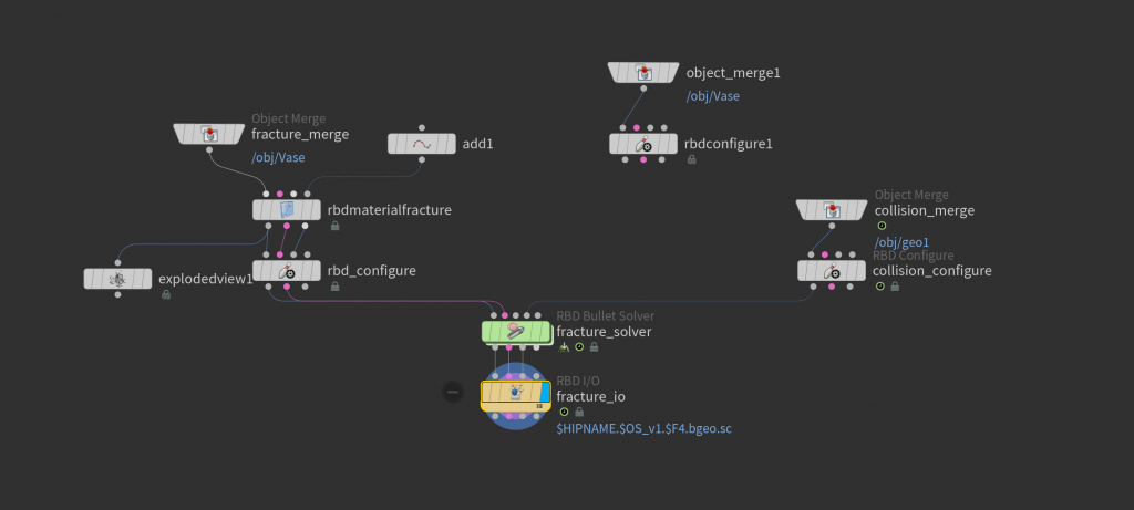 For the bullet itself, instead of just a simple collider, you can enable continuous collision detection (CCD) in the Bullet solver to prevent it from tunneling through the vase at high speed. You might also animate its velocity precisely or import it with initial momentum attributes, ensuring the solver reads it as a fast-moving, high-energy object. Adding an “impact” attribute or using an Impacts node inside the DOPnet lets you detect the exact collision frame, which can then drive secondary effects like spawning extra fractures or triggering particles.